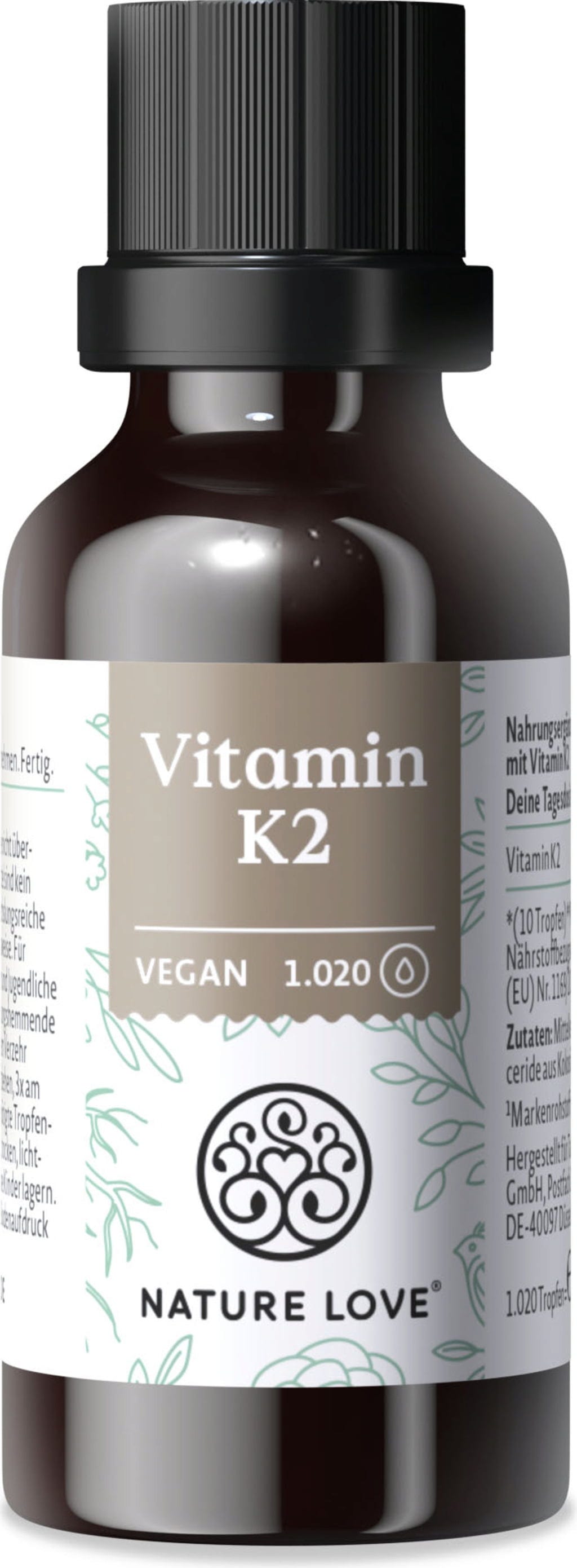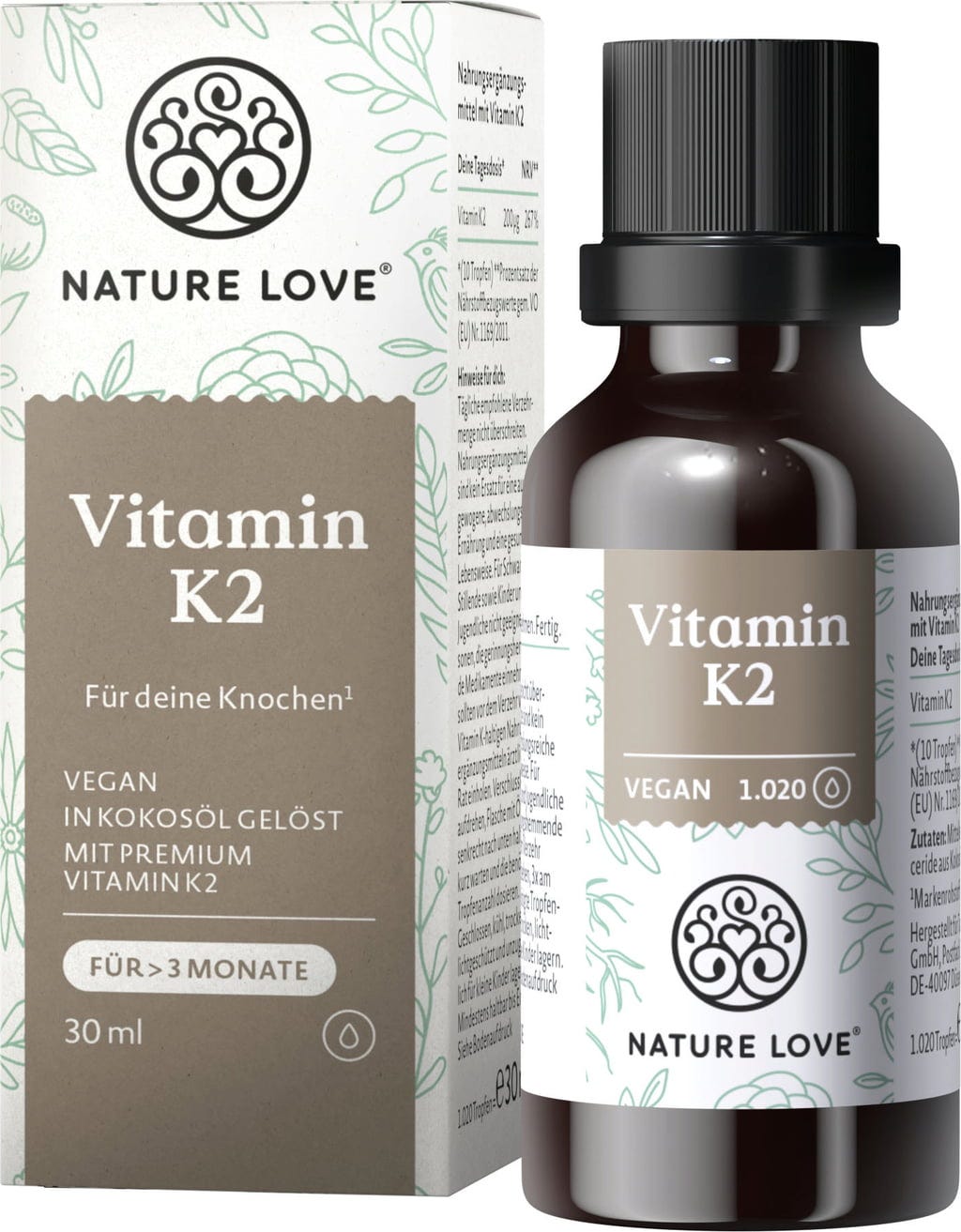 Nature Love Vitamin K2 är tillverkad av premiumråvaran K2VITAL®. Eftersom vitamin K2 är en fettlöslig vitamin innehåller denna produkt högkvalitativ MCT-olja från kokosnöt.