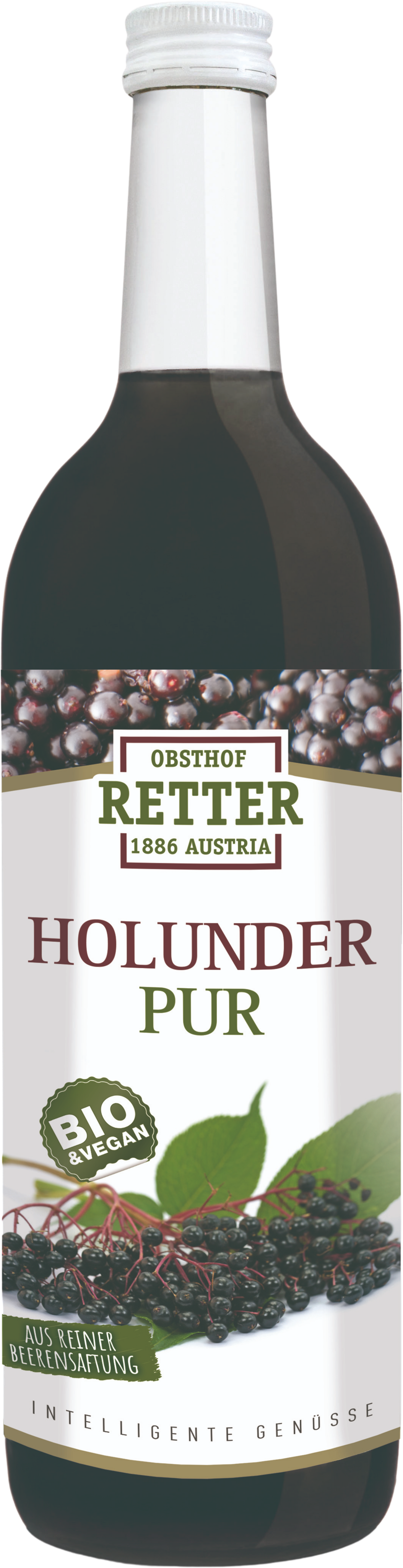Det svarta fläderbäret mognar i augusti och september och är inte lämpligt att konsumera i rått tillstånd. Den ekologiska fläderbärsjuicen från Obsthof Retter ger dock en fruktig förfriskning på ett ögonblick. Juicen är rik på C- och B-vitaminer. Den innehåller naturligtvis inga konstgjorda smakämnen, färgämnen eller konserveringsmedel.