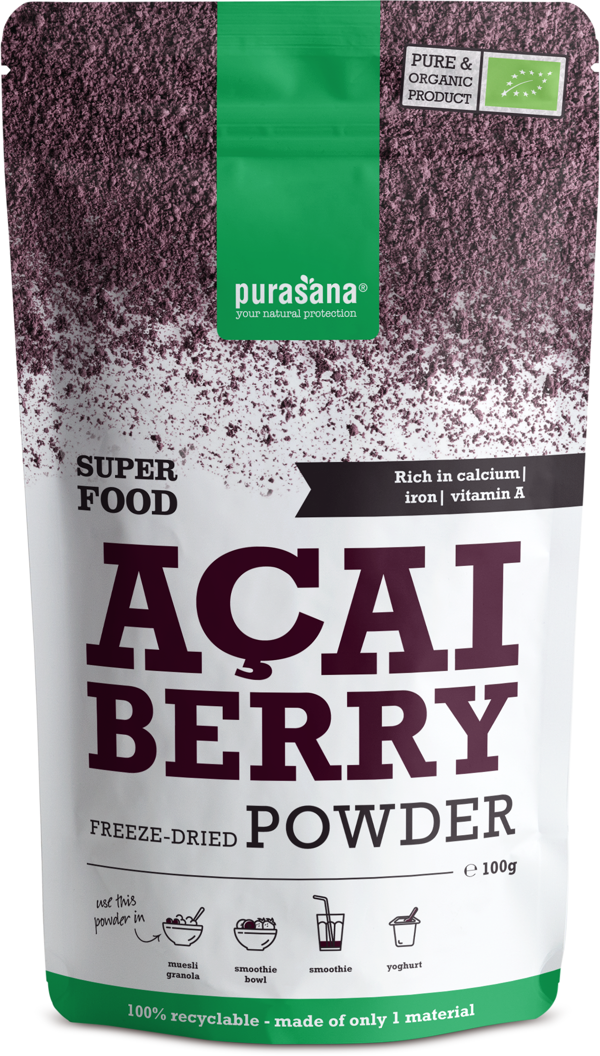 Akaibär är druvliknande bär som växer på palmer vid Amazonas stränder. När bären är mogna är de rika på näringsämnen och bearbetas till ljuslila pulver och frystorkas. Acaibär innehåller naturligt många näringsämnen och sekundära växtföreningar. Frystorkning bevarar dessa näringsämnen på bästa sätt.