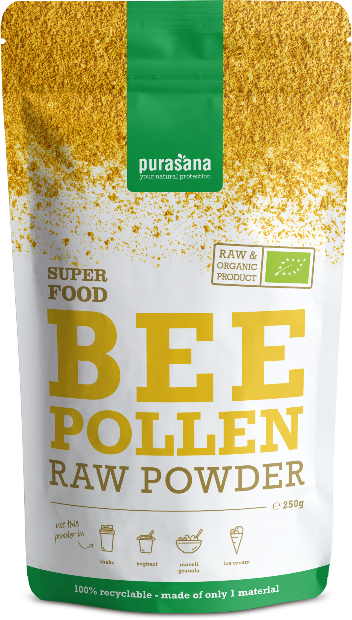 Purasana Organic Flower Pollen är blompollen som samlats in av bin: Bina blandar de mikroskopiska fröna med sin nektar för att få fram små bollar - pollen. Högst 50 % av pollenet samlas vid ingången till kupan. Detta garanterar att det fortfarande finns tillräckligt mycket kvar för bipopulationen. På grund av de många vilda blommorna på de spanska fälten är Purasana-pollen från Spanien bland de renaste och mest högkvalitativa bi-pollenerna. Bipollen innehåller viktiga aminosyror och är rikt på B-vitaminer.