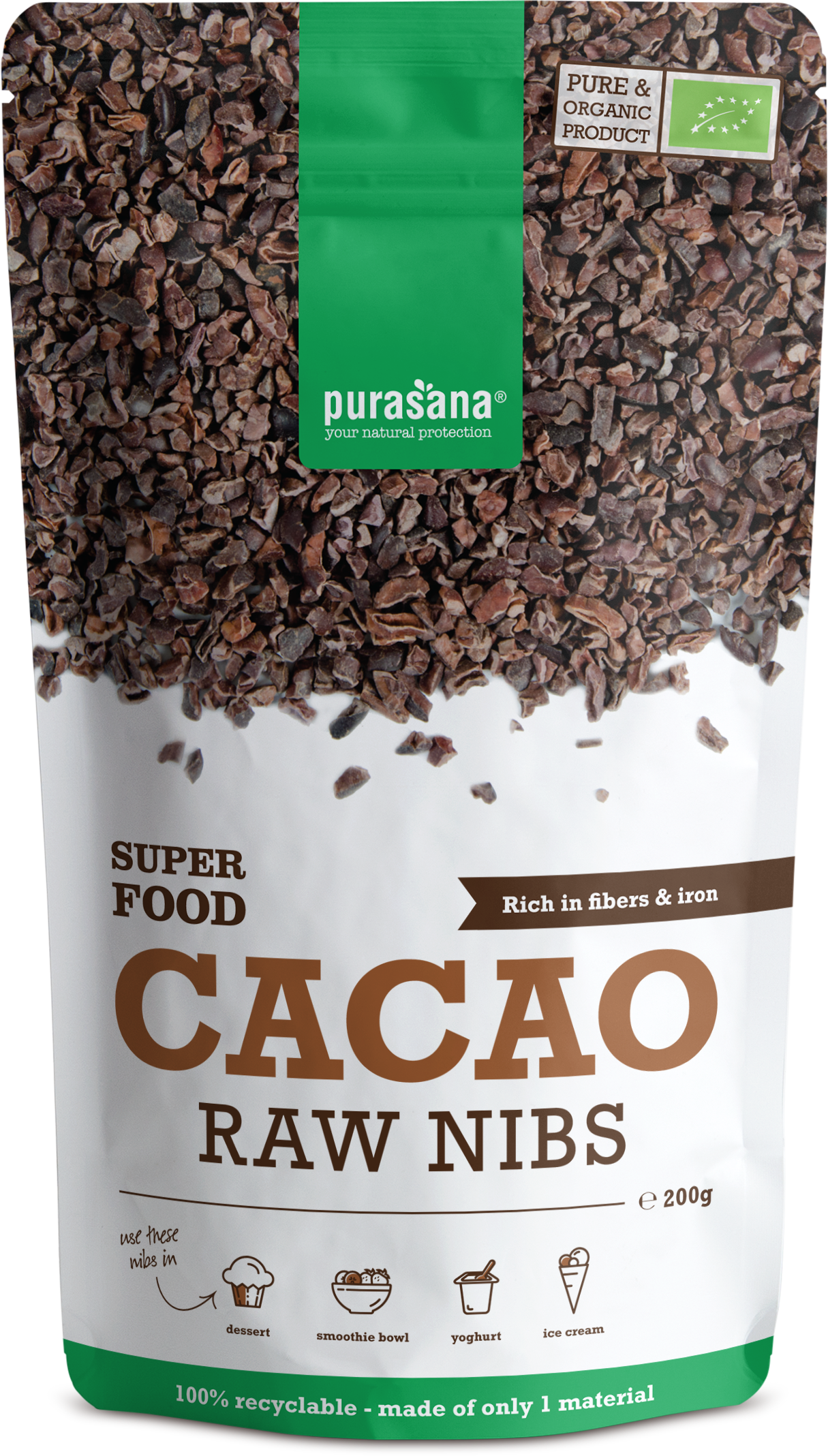 Purasanas kakaonibs är små bitar av ren rå kakao utan socker eller smakförstärkare. Kakao innehåller naturligt många speciella näringsämnen, fytokemikalier och har länge varit underskattad på grund av fett och socker.