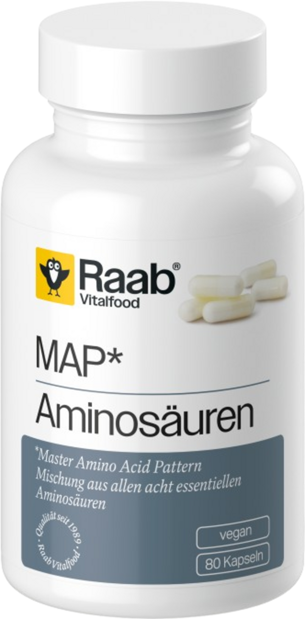 MAP aminosyrakapslarna från Raab Vitalfood innehåller de viktigaste aminosyrorna från fermentering. Förkortningen MAP står för Master Amino Acid Pattern och beskriver en optimal blandning av alla åtta essentiella aminosyror i ett specifikt förhållande. Detta maximerar den andel som absorberas av kroppen. Kapslarna är veganska och helt fria från fyllnadsmedel.