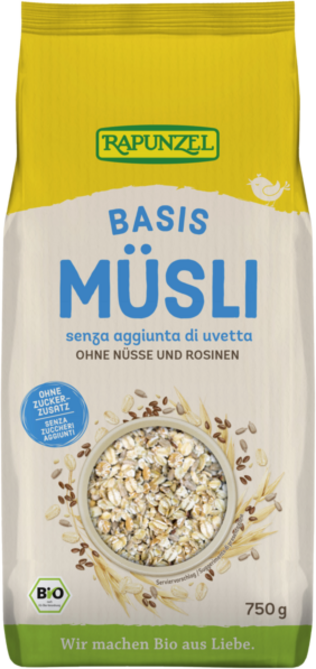 För dem som gillar att förbereda sin egen frukostmüsli med färsk frukt eller andra ingredienser innehåller Rapunzel's Basis Müsli inga nötter eller torkad frukt. Receptet innehåller inte heller något tillsatt socker. Den hjärtliga, hälsosamma smaken kommer enbart från den välsmakande blandningen av olika spannmålsflingor, linfrön, sesam- och solrosfrön.