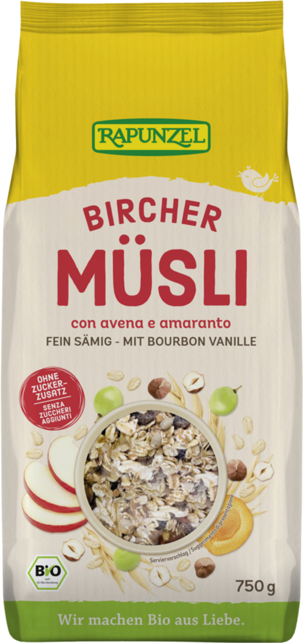 Äppelbitar, havreflingor och hasselnötter - Rapunzel följer den schweiziske läkaren Maximilian Birchers traditionella recept. Blandningen förädlas med amarant och bourbonvanilj. För många müslifans är det en av de bästa frukostidéerna någonsin! Det är definitivt en näringsrik, vegansk start på dagen.