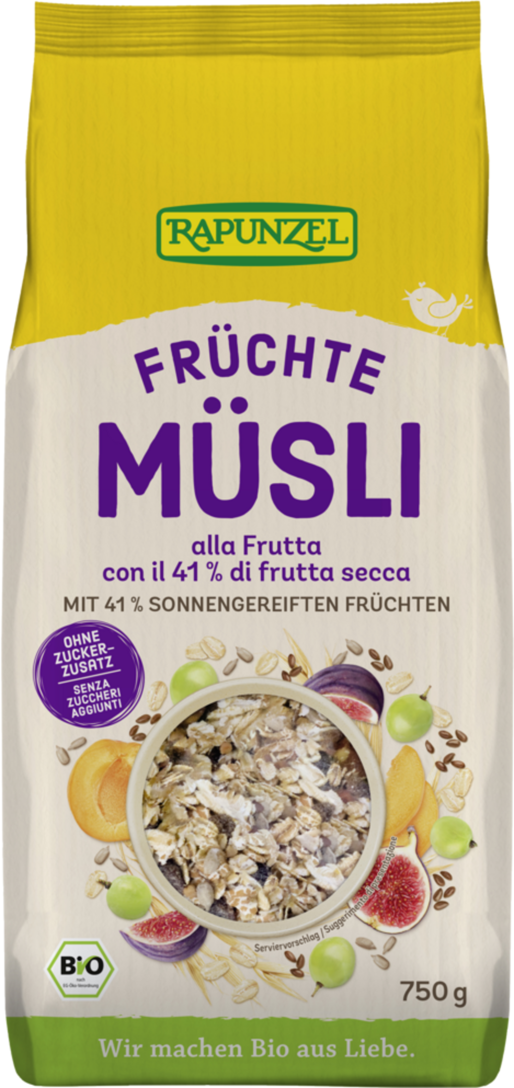 För en särskilt fruktig start på dagen har Rapunzels ekologiska fruktmüsli ett fruktinnehåll på minst 40 procent. Den fruktiga och kärnfulla müsliblandningen har inget tillsatt socker alls, eftersom sötman endast kommer från aromatiska aprikoser, fikon och sultanrussin.