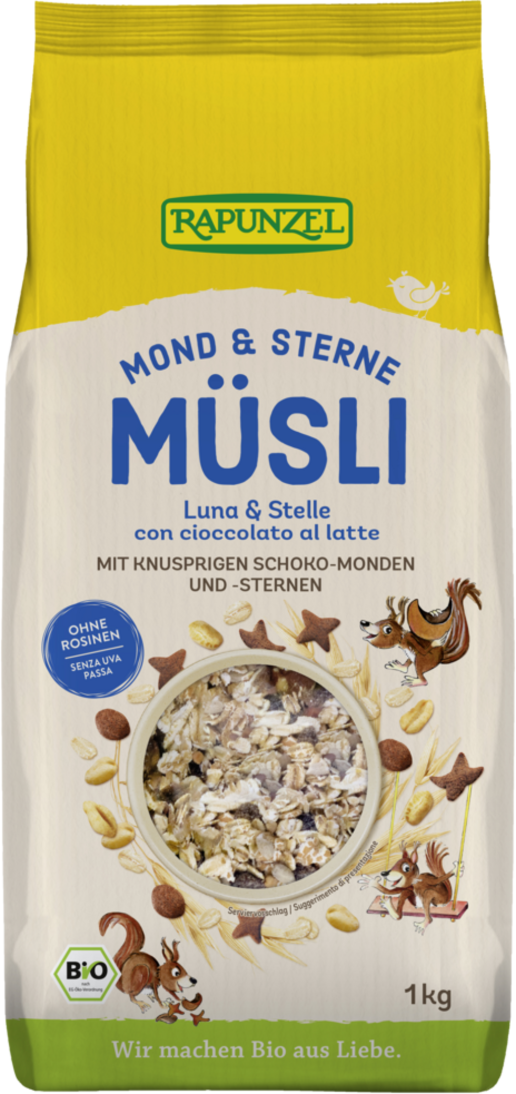 Luftiga månar och stjärnor av chokladknaprigt, näringsrika spannmålsflingor, fullkornsflakes och söta mjölkchokladrasp gör detta müsli till en frukostfavorit för både barn och vuxna! Perfekt att blanda med färsk frukt, yoghurt eller växtbaserade drycker. Spannmålet i detta müsli kommer från ekologiska odlingar i Tyskland.
