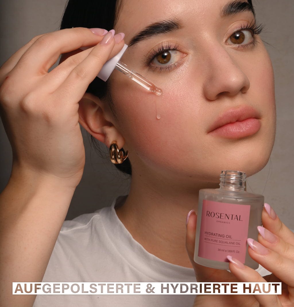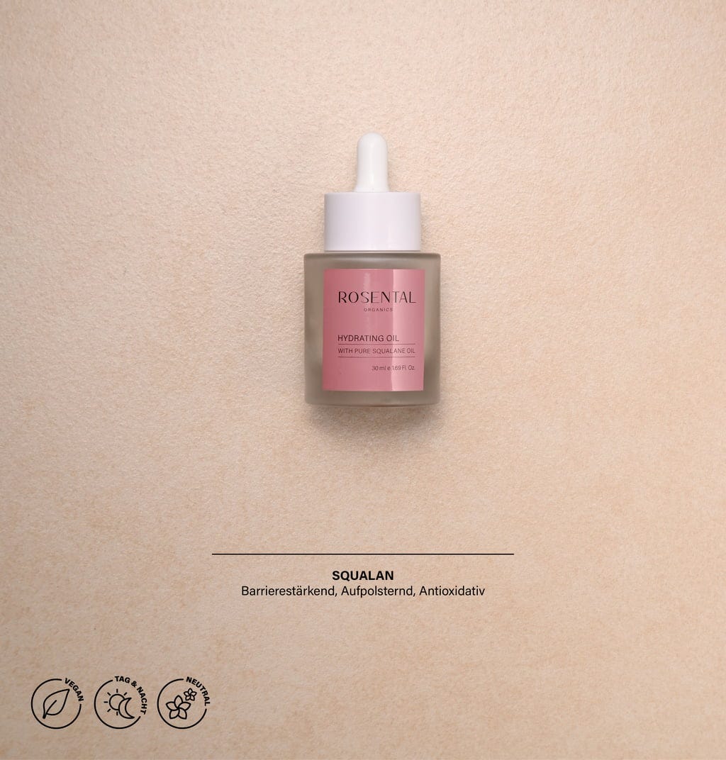 Rosental Organics Hydrating Oil innehåller fytoskvalan, som har intensivt återfuktande egenskaper och erhålls från pressande rester av olivolja. Den anses vara särskilt snäll mot huden och skyddar huden från att torka ut. Vid regelbunden användning slätas fina linjer och rynkor ut. Ansiktsoljan har även antioxidantegenskaper och skyddar din hud från fria radikaler och miljöpåverkan. Konsistensen är mycket lätt, absorberas snabbt och lämnar inte en fet hinna på huden.