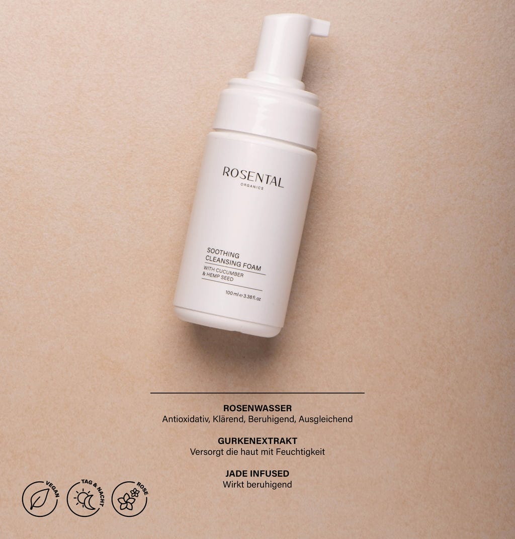 Det Jade-infunderade Soothing Cleansing Foam från Rosental Organics tar bort orenheter på ett extremt skonsamt och grundligt sätt. Dess naturliga aktiva ingredienskomplex av gurka och rosextrakt ger näring och stärker huden. Ansiktet tillförs optimalt fukt och porerna rengörs och förfinas på djupet.