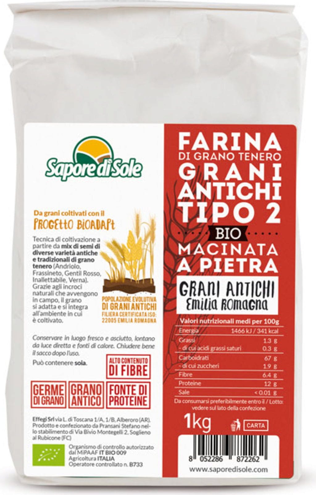 För Romagna Typ 2-mjölet från Sapore di Sole mals gamla och traditionella mjuka vetesorter till ett urgammalt spannmålsmjöl. Vetet integreras i de naturliga frökorsningarna på fältet. Typ 2-mjöl är perfekt för slätt bröd, pizza, piadina eller smördeg. Testa även kak- och dessertkreationer med den.