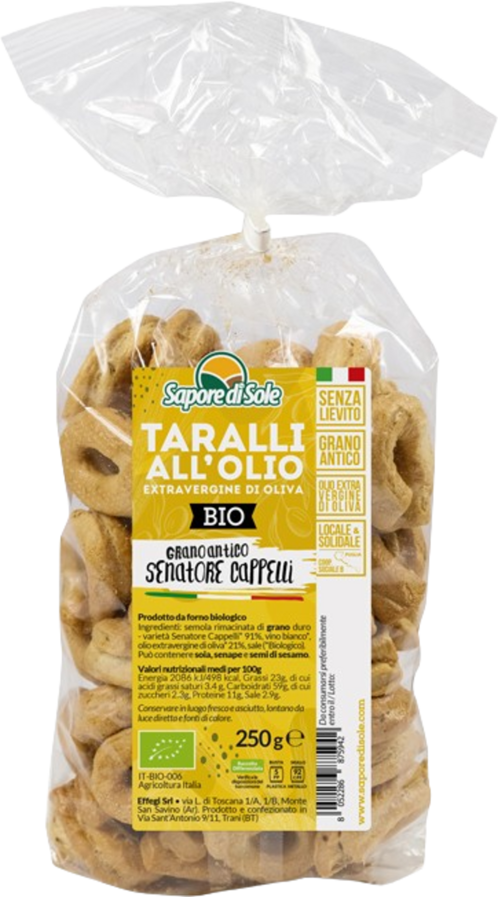 Taralli är ett typiskt apuliskt mellanmål som görs enligt ett originalrecept som inte använder jäst. Endast extra jungfruolivolja från Coratina och vetegryn från Senatore Cappelli används. Resultatet är lätta, krispiga och knapriga taralli som är perfekta som aperitif eller mellanmål.