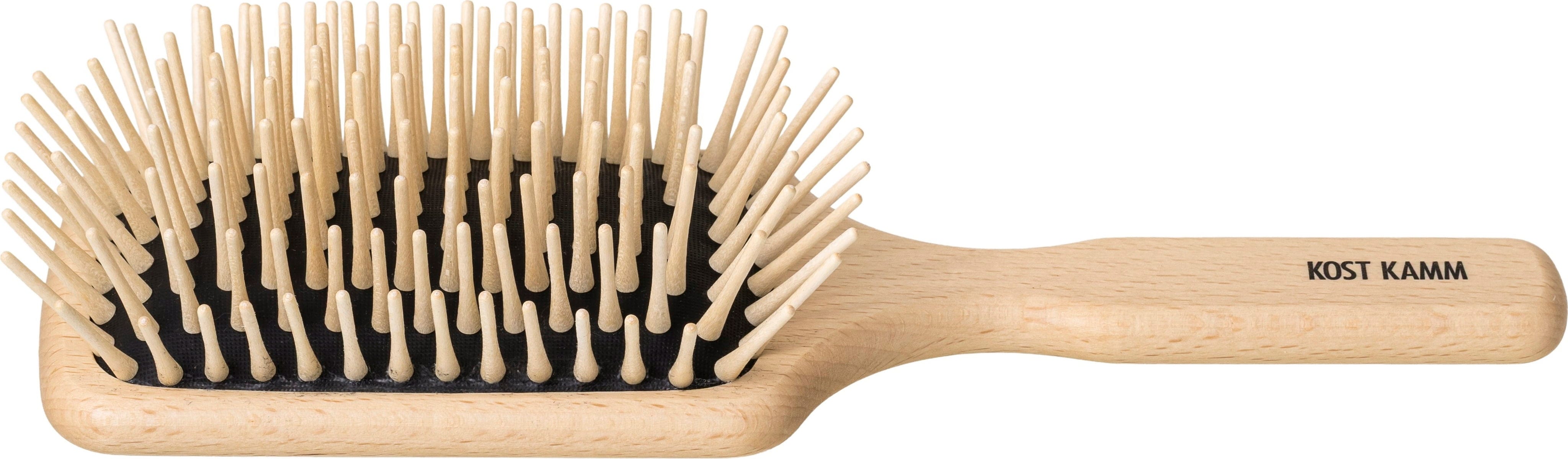 Den 9-radiga paddle brush med raka, extra långa träpiggar passar bra för långt, rakt eller vågigt hår. Den är tillverkad av trä med en bas av naturgummi.