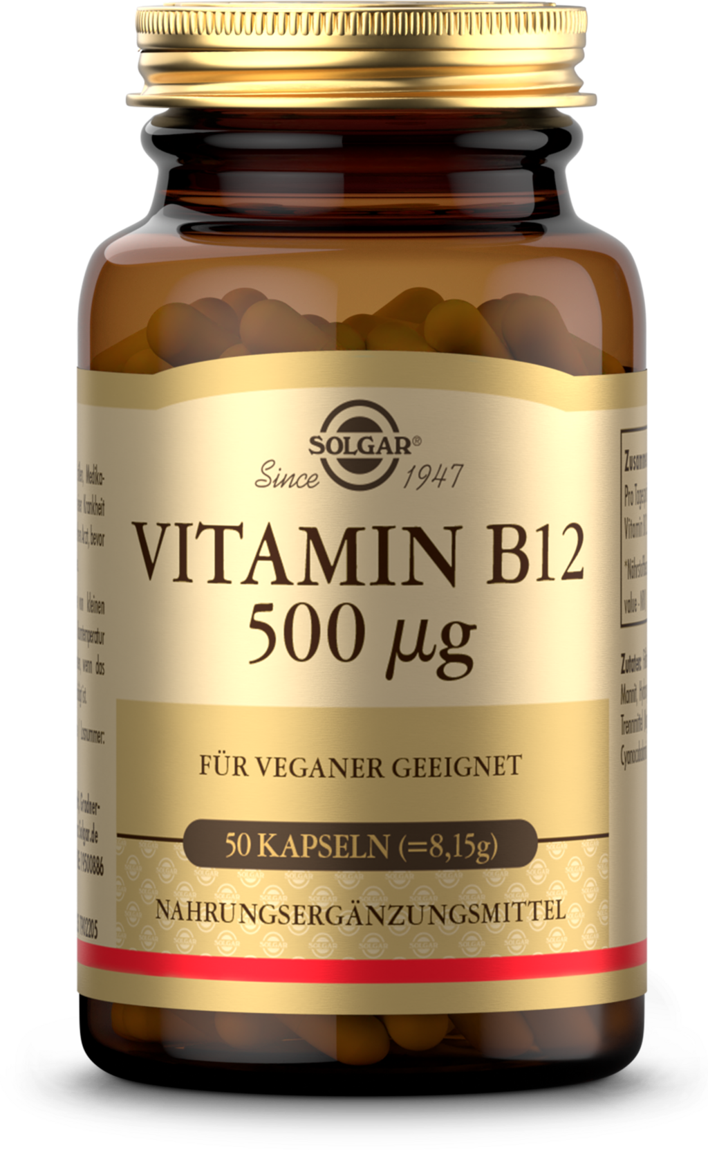 Letar du efter en tillförlitlig källa till vitamin B12? Solgar® erbjuder högkvalitativt vitamin B12 i en smidig dagsdos på 500 µg – perfekt för vardagsbruk och särskilt anpassat för dig som följer en vegansk eller vegetarisk kost. Vitamin B12 bidrar bland annat till en normal energimetabolism och nervsystemets normala funktion.