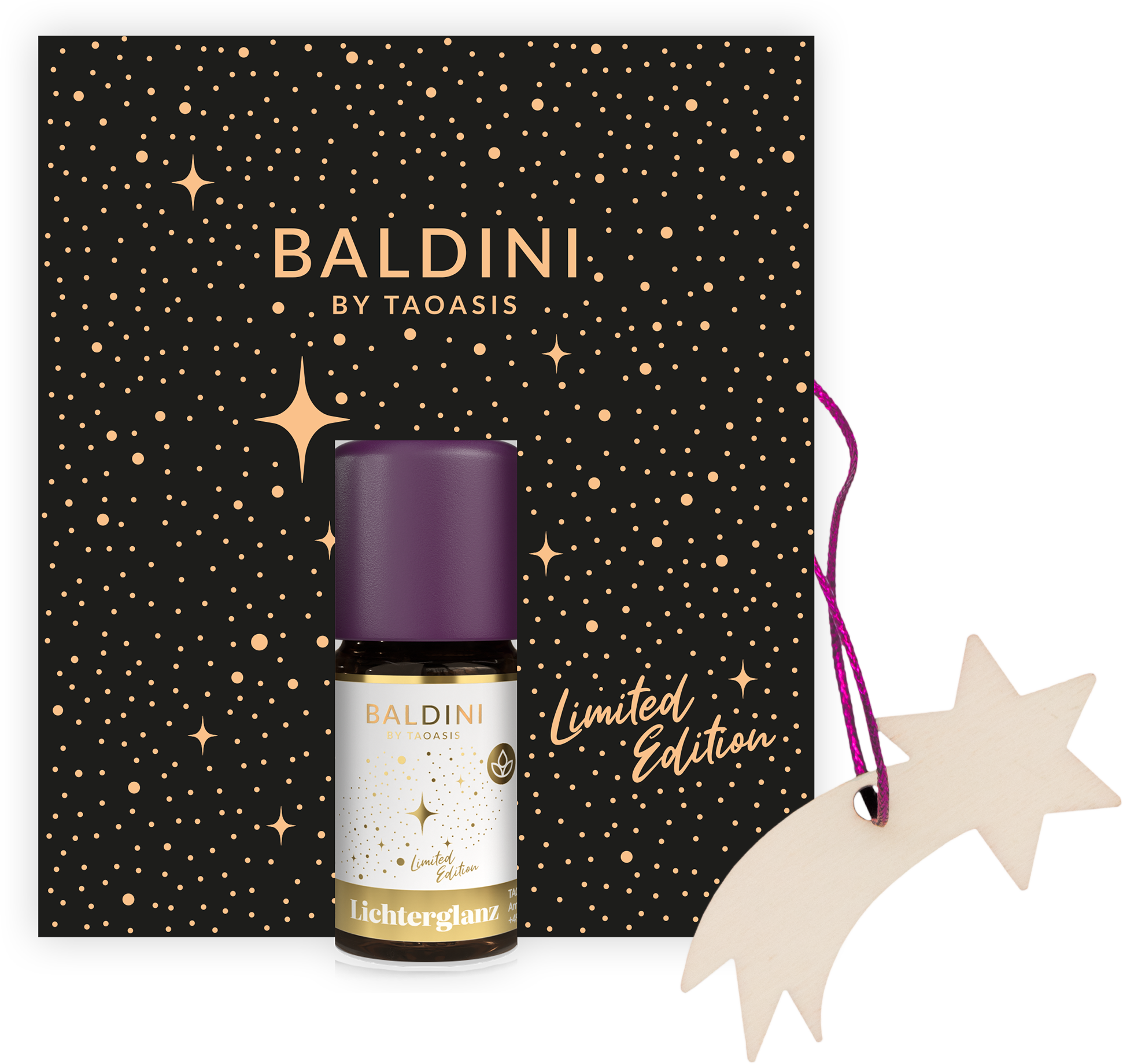 Detta presentset innehåller doftoljan Ljusglans och ett trä-hänge. Doftoljan kombinerar bergamott, irisrot och benzoin i en sensuellt varm och festlig komposition.
