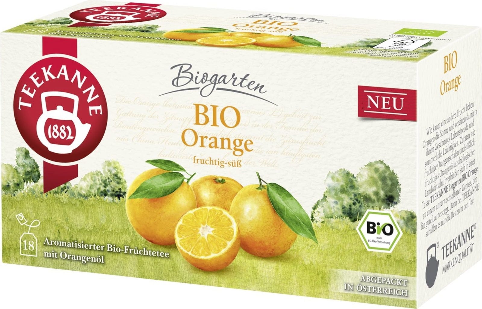 Ett somrigt ekologiskt fruktte med äpple, hibiskus, aroniabär och apelsinskal, smaksatt med apelsinolja. Stevia (söta blad) förädlar smaken med naturlig sötma. En fruktig TEEKANNE ekologisk trädgårdsskapelse inspirerad av söderns sol.