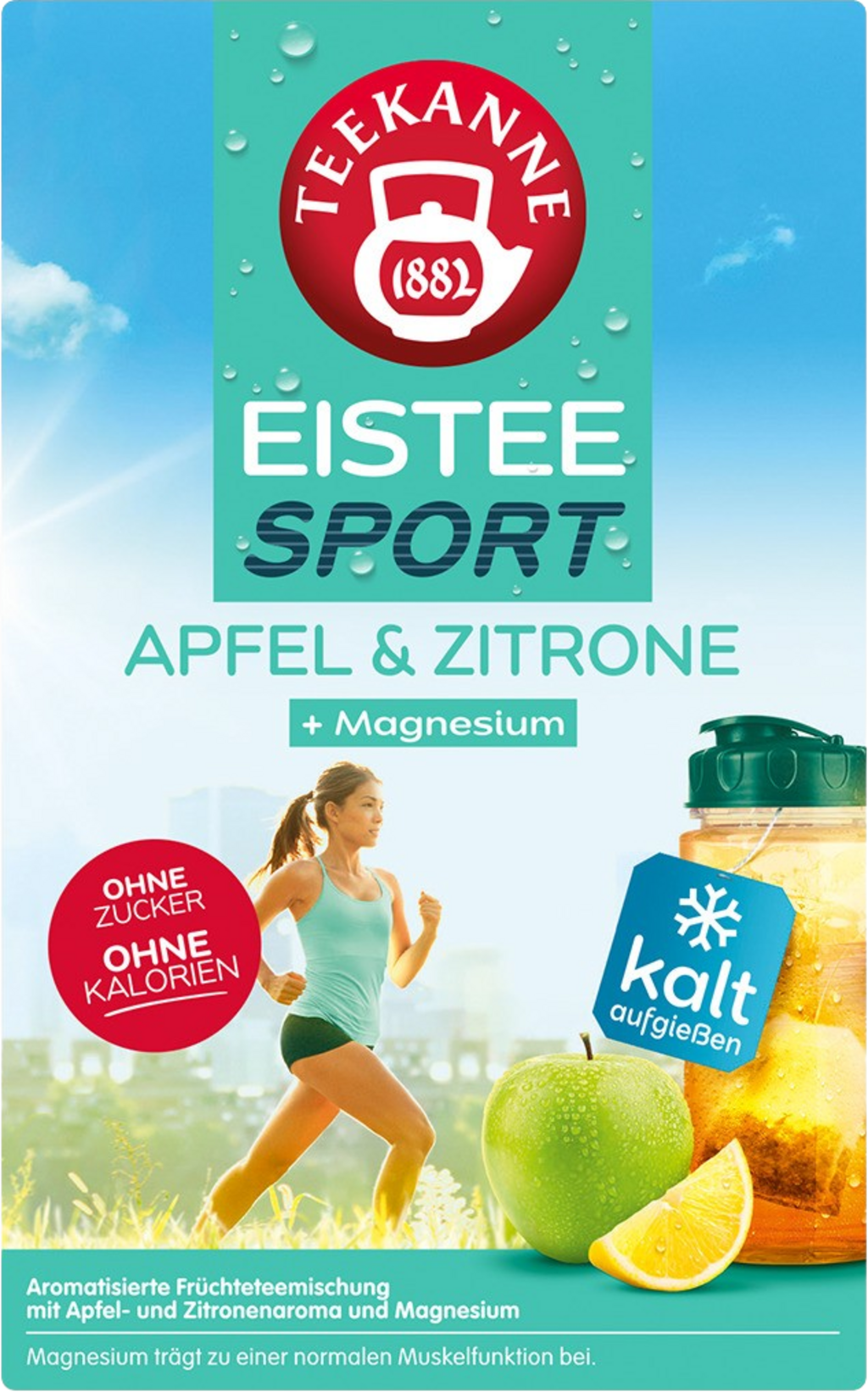 TEEKANNE Iste Sport Äpple-Citron med Magnesium är ett smaksatt fruktte för kalla infusioner med kranvatten - perfekt för till exempel på cykel- eller vandringsturer. Magnesium berikar receptet för att optimalt stödja sportaktiviteter; Den piggar också upp teälskare i deras vardag och skämmer bort dem även med massor av smak – en riktig tehöjdpunkt med mervärde!