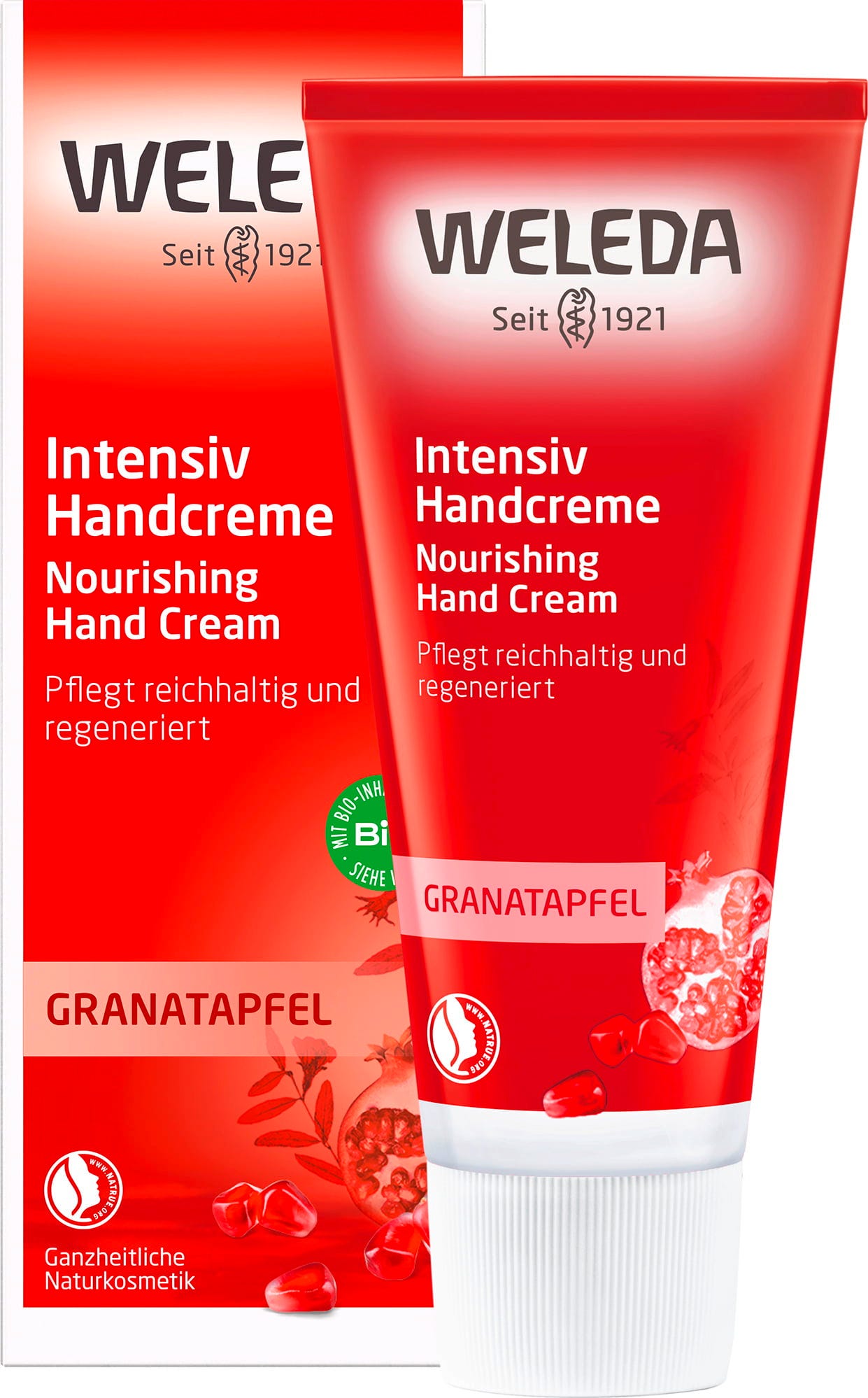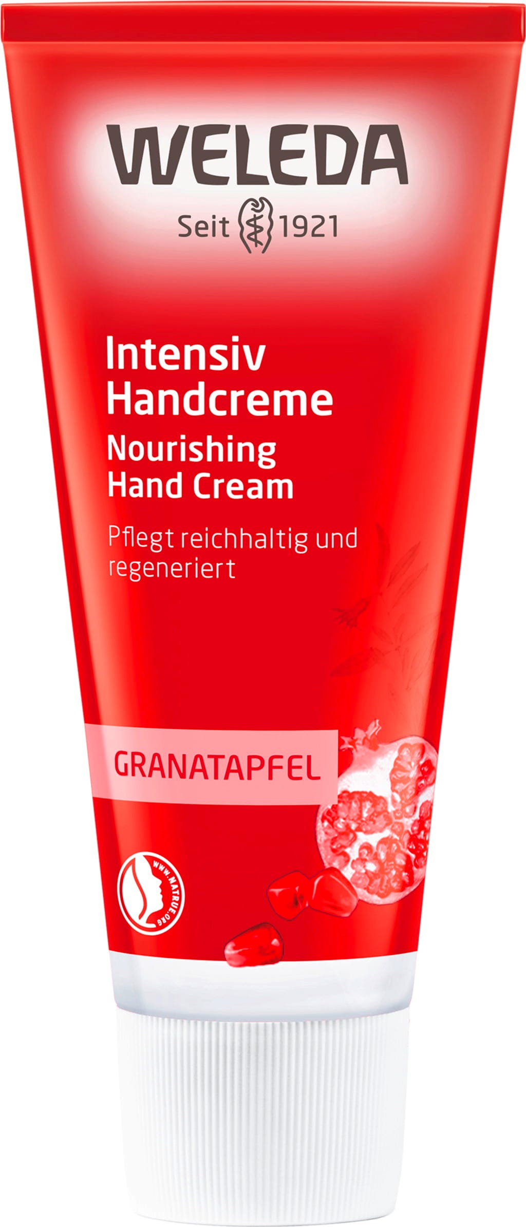 Den intensiva handkrämen från Weledas granatäpplelinje ger näring åt krävande hud från 40 års ålder och ger den ny smidighet. Antioxidantkomplex av aktiva ingredienser motverkar för tidig hudåldring och skyddar aktivt mot skadliga miljöpåverkan, medan sesamolja och sheasmör skyddar huden mot fuktförlust. Guld hirsextrakt främjar också elasticitet. Doften av apelsin, davana och vanilj är feminin och sensuell.