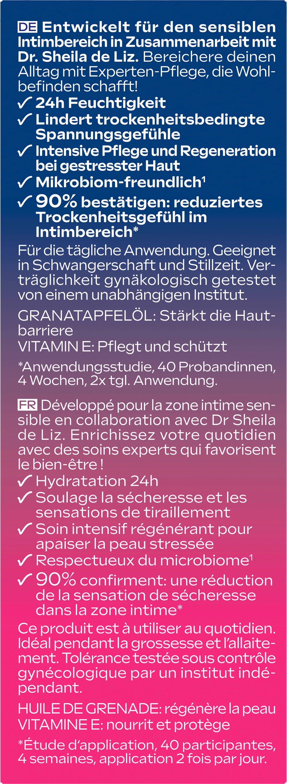 Denna vlora Velvet Protection Oil utvecklades i samarbete med Dr. Sheila de Liz. Den berikar din vardag med expertvård för det känsliga intimområdet och förebygger känslor av stramhet orsakad av torrhet.