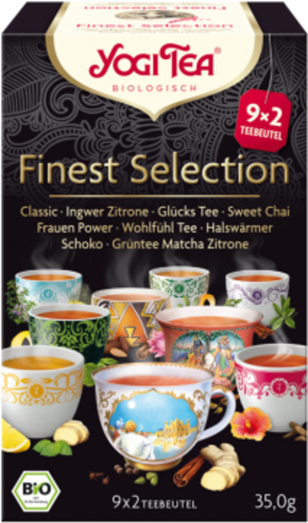 Denna Finest Selection från YOGI TEA innehåller 2 tepåsar av vardera 9 olika sorter:
