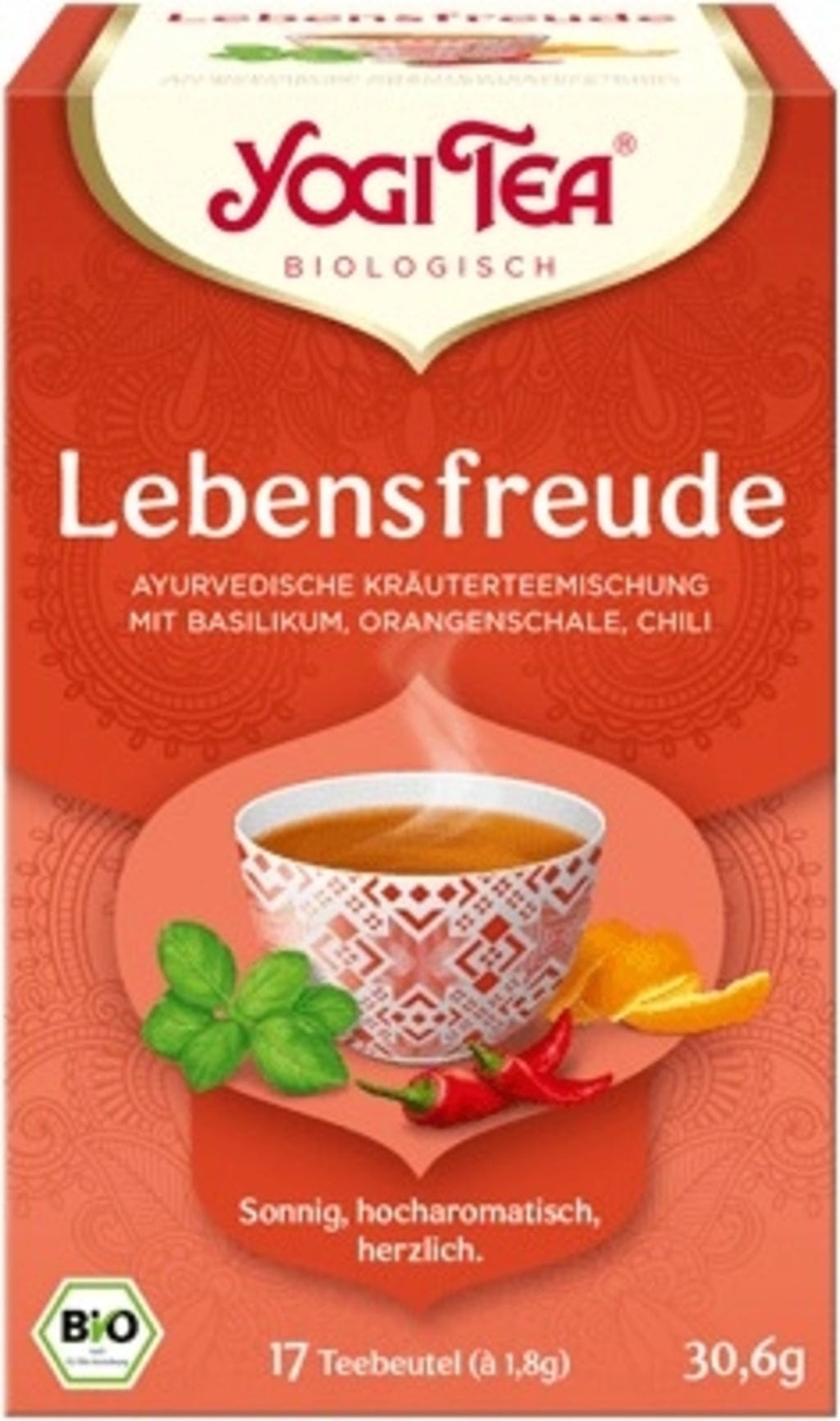 Basilika är den söta örternas drottning, bjuder in till fest tillsammans med kanel, ingefära & kardemumma. YOGI TEA® Livsglädje får dessutom en livfull twist med mexikansk chili & lakritsrot. Ett riktigt smakfyrverkeri i koppen, som fyller själen med värme, glädje & inre välbefinnande.